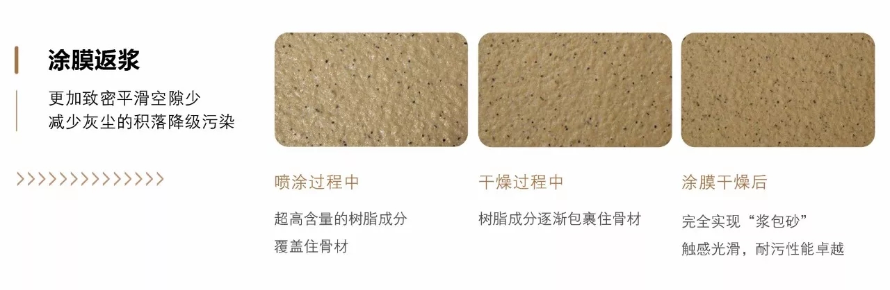 與傳統噴涂真石漆低用量的返砂、發花不同,明上江南印象真石漆具有更高的乳液含量,1.8kg/㎡涂膜返漿不發花!